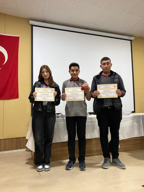 Okulumuz öğrencilerinden Muhammet Mustafa BOZLAK birinci, Elif Rana YOZGAT ikinci ve Adem ŞAHİN'in üçüncü olduğu, ÇEDES kapsamında düzenlenen Dinim İslam adlı okuma yarışmasında ödüllerini aldılar. Ödül kapsamında birinciye gram altın, birinci ikinci ve üçüncüye çeşitli hediyeler verildi.